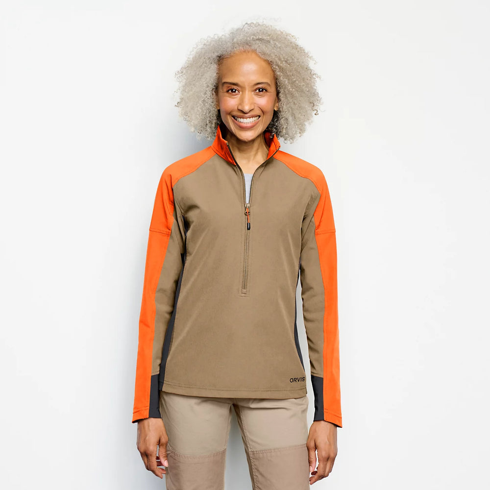 On cool, early season mornings, this versatile Women's PRO LT Softshell Pullover will give you the extra layer you need to fight the chill and damp. When the day warms up, it packs down super small to fit in your vest or pack. The DWR finish sheds moisture and the tightly woven, yet highly breathable double-weave fabric resists punctures and keeps you cool during activity. With ample stretch in both body and side panels, this pullover moves easily through the shot. Deep three-quarter zip aids temperature regulation and allows easy on-and-off. Hidden lower back pocket with side entry holds small valuables safely. Stretchy contour cuffs have a comfortable close fit, and provide extra protection from the elements and brush. For safety afield, ample blaze patches meet most state minimum sq. in. requirements. Active fit.